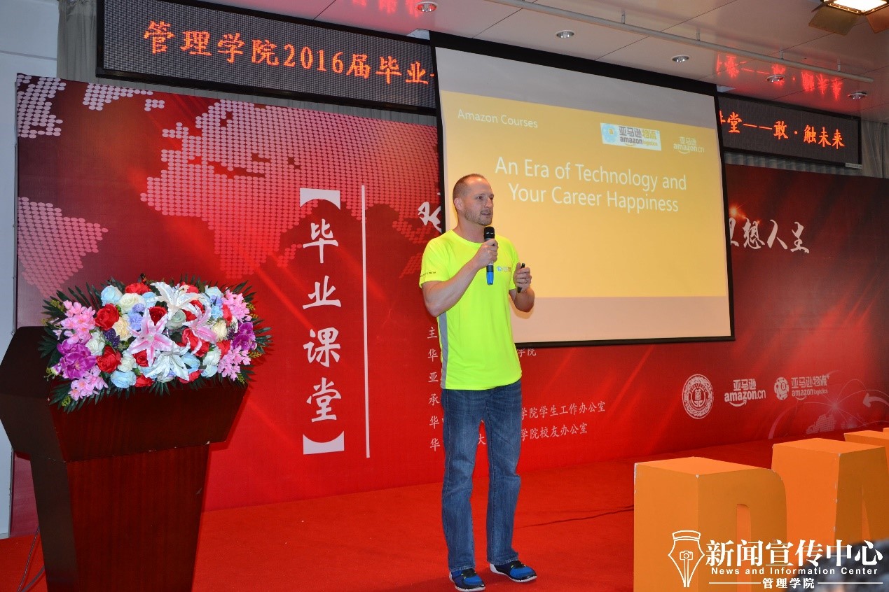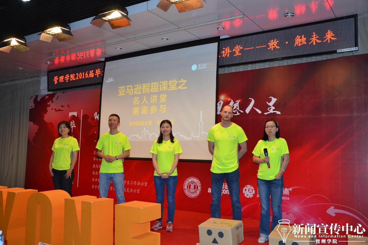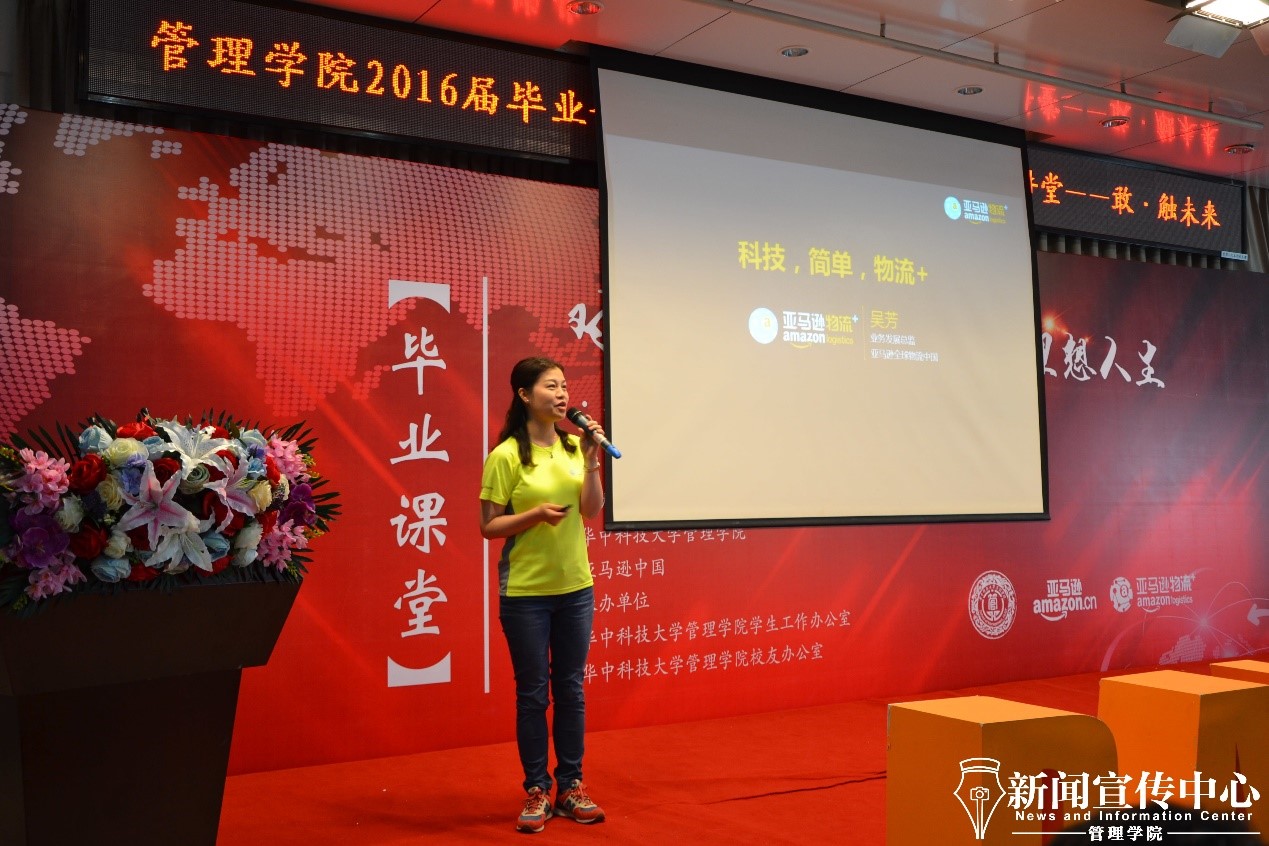 当天下午两点,“毕业课堂”之亚马逊智趣课堂在我院206报告厅隆重举行,亚马逊全球物流中国副总裁携高管团队为毕业生带来大学的最后一课。亚马逊全球物流中国运营副总裁孙昱晴、人力资源副总裁濮瑞龙、业务发展总监吴芳、运营总监董长庆,我院党委书记金凌志、党委副书记周智皎,生产运作与物流管理系教授刘志学、徐贤浩、李昆鹏出席了本次活动。