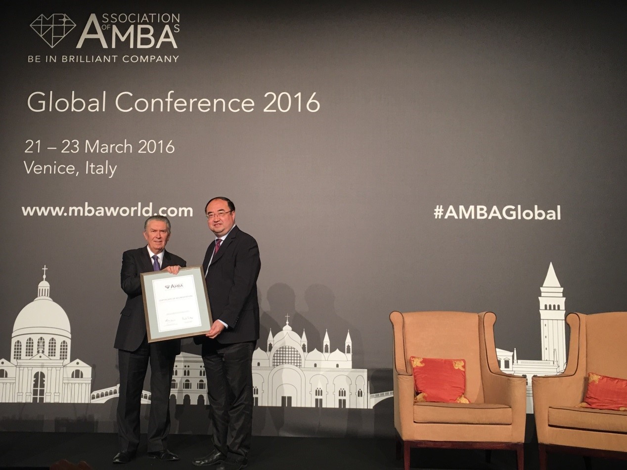 (通讯员:李娟)2016年3月22日,从在意大利威尼斯召开的2016全球AMBA(英国工商管理硕士协会,Association of MBAs,简称AMBA ) 会议上传来好消息,我院院长王宗军教授从AMBA主席Sir Paul Judge手中接过AMBA再认证证书...