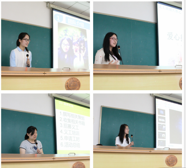 接着进入答辩环节。“爱心传递员”,“移动图书馆”,“爱心打水”,“爱不孤单”四个代表小组依次分别进行了展示。