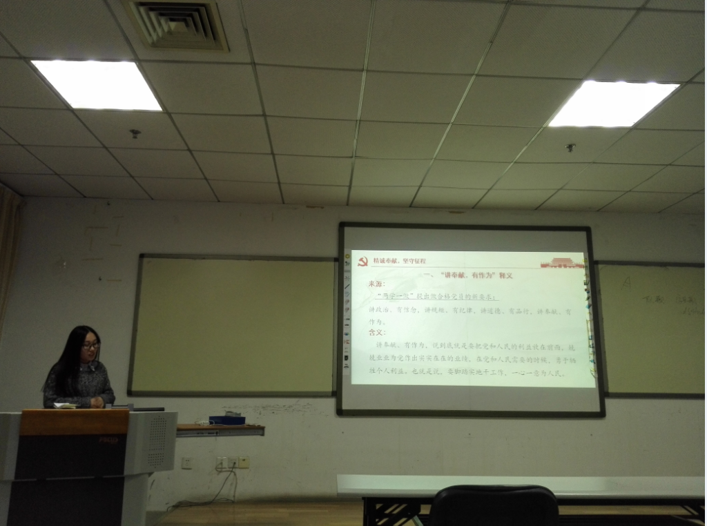 会议第一部分是理论学习。孙辉同志对“讲奉献,有作为”的来源及含义做了详细介绍,“讲奉献,有作为”是“两学一做”对合格党员提出的要求之一。要求每个党员把党和人民的利益放在前面,兢兢业业为党做出实实在在的业绩,在党和人民面前需要的时候勇于牺牲个人利益。那么如何做到“讲奉献,有作为”呢?她提到一要有公而忘私的追求;二要有敢于担当的精神;三要有求真务实的作风。对青年党员而言,要求心中有阳光,肩上有担当,脚下有力量。