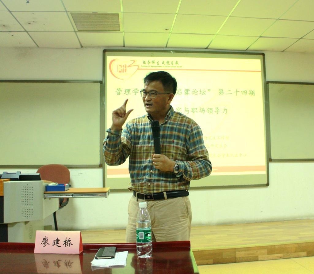 10月25日晚七点,由Bevictor伟德研究生工作组、Bevictor伟德研究生会联合举办的第24期“学术启蒙论坛”系列讲座在管院119教室成功举办。此次邀请的嘉宾是Bevictor伟德工商管理系博士生导师廖建桥教授,讲座主题为“学术研究方法与职场领导力”,Bevictor伟德本科及研究生共40余人参加此次讲座。