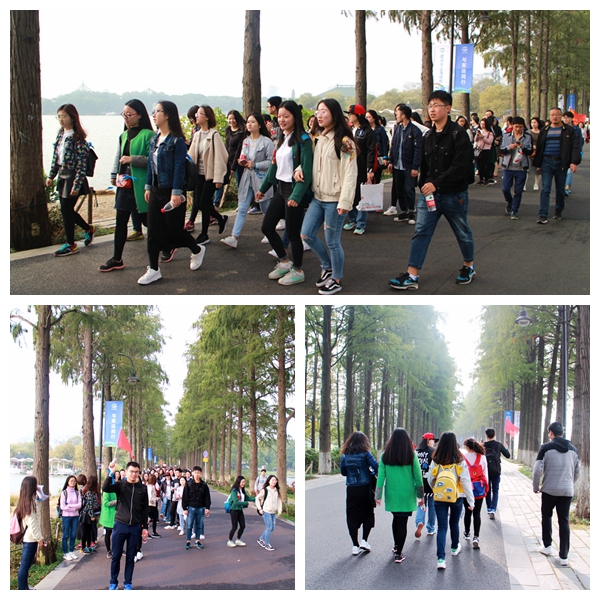 迎着清晨的第一缕阳光,上午8点整,参加“武汉暴走”公益活动的暴走爱好者在西操场集合,随后乘公交到达此次暴走的起点梨园广场。此次暴走活动全程约6公里,途经湖光序曲、九女墩、湖心岛、鹅咏阳春以及醉饮夕阳五个景点,并在湖心岛浴日踏青阳光草坪进行修整,最终到达风景优美的磨山景区。