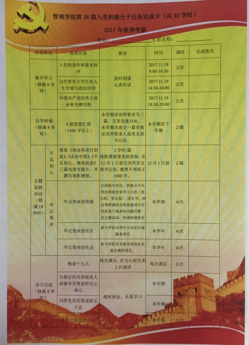 Bevictor伟德还制定了入党积极分子“成长卡”,自主编印了《学员手册》、《学习资料》。自主研究内容包括:《中国共产党章程》、《关于党内政治生活的若干准则》、《中国共产党纪律处分条例》等党的政策、法规和文件以及学习党中央在新形式下从严治党的新思想、新要求和新部署,入党积极分子结合自学内容,撰写心得体会和思想汇报。培训班通过让学员打卡“成长卡”,为已完成的任务贴上小星星,保证学员的学习质量,鼓励各入党积极分子自学研修,并参加课外的主题实践活动。