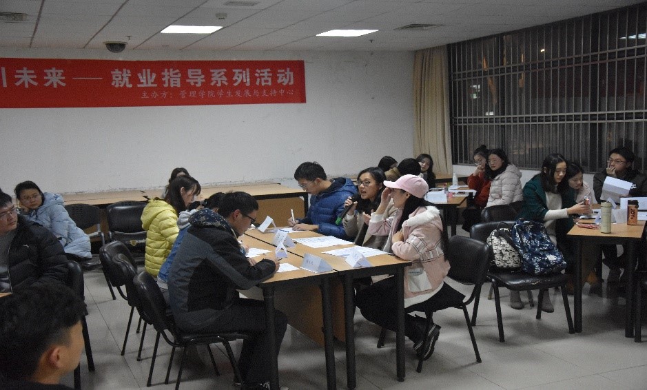 接下来,每个小组中选出一名成员来进行模拟群体面试,面试者们针对面试问题进行了精彩的答辩。其他同学则扮演招聘的负责人,在听完了群面小组代表的观点阐述后分别对参加群体面试中本“企业”感兴趣的同学进行了提问,提问中在场的同学再一次加深了对群体面试的理解,也对以后面试中应该注意的问题有了进一步的思考。最后每个“单位”、“企业”现场手绘聘用书,对参加模拟面试的各位同学的表现予以肯定。