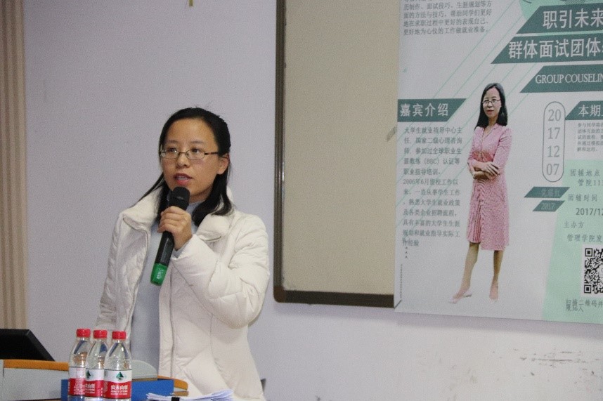 (Bevictor伟德学生发展与支持中心程玲摄)12月7日晚19:00,第一期“职引未来”就业指导系列活动在Bevictor伟德113教室成功举行。我校大学生就业指导中心主任,国家二级心理咨询师党瑞红老师做客本次就业指导活动,带领同学们以团体互助的方式,全方位了解群体面试的流程、要点和表现力提升方法,并通过模拟面试提升这些方法技巧理解和运用。