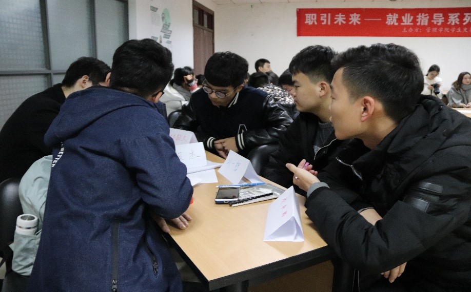 活动伊始,在党老师的指导下,同学们通过两两一组互相介绍自己优点的方式迈出了认识其他活动参与者的第一步。随后同学们分成六组,组成六家各具特色的“公司”,并根据公司和单位的简介、招聘职位发布自己的招聘需求。同学们全情投入,不仅在有限的时间内设计出了非常细致的招聘需求,在发布环节更是变身“CEO”、“书记”吸引同学们的注意,同时也体会到了在看招聘简章是应该重点关注的内容。