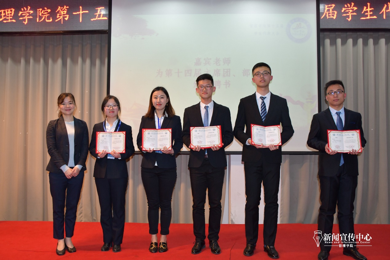 最后,周智皎对第十四届分团委学生会各干事过去一年的工作给予了高度评价,肯定了他们的三个进步:一、思想引领工作显著加强;二、学生活动文化内涵显著提升;三、服务同学的理念在具体活动中得以实践,并更加细化。同时,她也对新一届学生会提出了自己的殷切期望:第一,坚持党的领导,坚持用中国梦引领青年学生;第二,围绕学校“三品”校园建设要求开展各项工作;第三,合理有序地表达维护学生的合法权益,搭建学院与学生之间的沟通桥梁,切实为广大学子做实事、办好事;第四,从严从实加强学生会自身工作建设,运用所学专业知识推进各项改革。