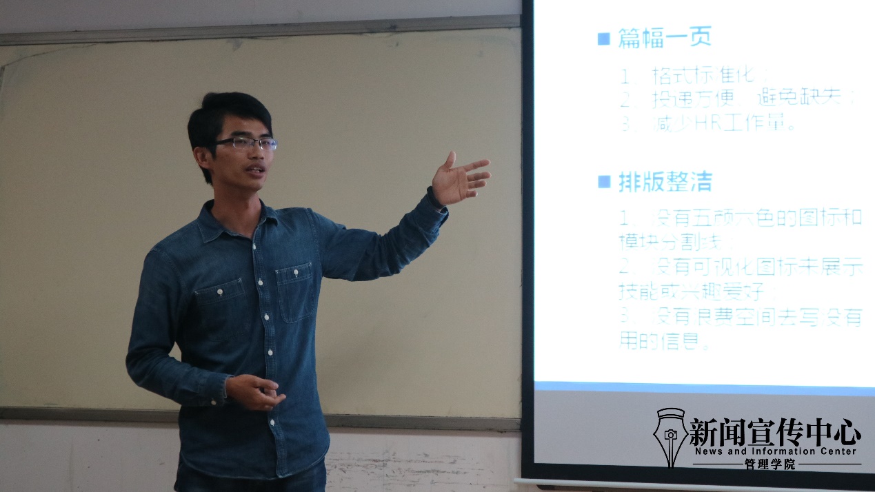 随后,冷强主要就简历制作与面试经验进行了分享。为了让HR对个人简历一目了然,在短时间内发现闪光点,他认为做简历需要做到“篇幅一页,排班整洁,重点突出,文字精炼,格式正确,匹配设计”。应对面试阶段,冷强对每一个环节都展开了详细分析并提出了相应的建议,他强调要忠于内心,保持自信,选择适合自己的offer。