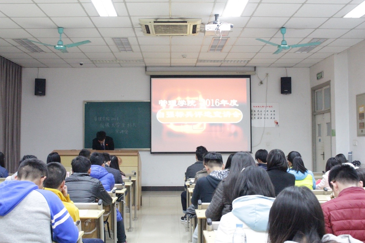 宣讲会伊始,资委会委员介绍了自强标兵评选的流程、要求及规则。评选活动主要分为五个阶段。第一阶段是前期宣传,包括评选自强标兵的条件,自强标兵可以获得的荣誉,资助助理的工作三个部分。思想积极向上,品格优良,敢于直面困难,自强不息的本科生才可以参与评选自强标兵;自强标兵在获得荣誉称号的同时,还可以获得申请奖学金的加分;期间,资助助理将鼓励符合条件的同学积极参与,并监督各班及时上交资料,以保证评选活动顺利进行。