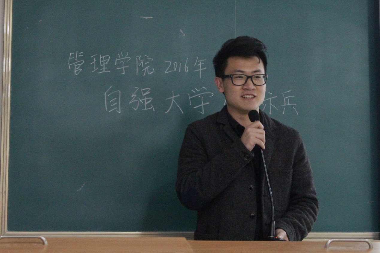 介绍完评选流程后,2015年度自强标兵代表文雅茜和邹兴先后进行了发言。文雅茜分享了她的做志愿者的经历,从小做起,从点滴做起。邹兴分享了他评选自强标兵后的成长,学习成绩加权从71到80+,从学生组织部员到负责人,从志愿者到组织者。他们因为自己的努力评选上自强标兵,又在这份荣誉下获得成长。2015年度自强标兵的另外一位获得者阮泽慧,因为在北京实习不能赶来现场,但是发来音频为本届候选人加油,分享经验。随后,张春青发表了简短讲话。他讲到我们应该要执着、坚持,有自己的特色。