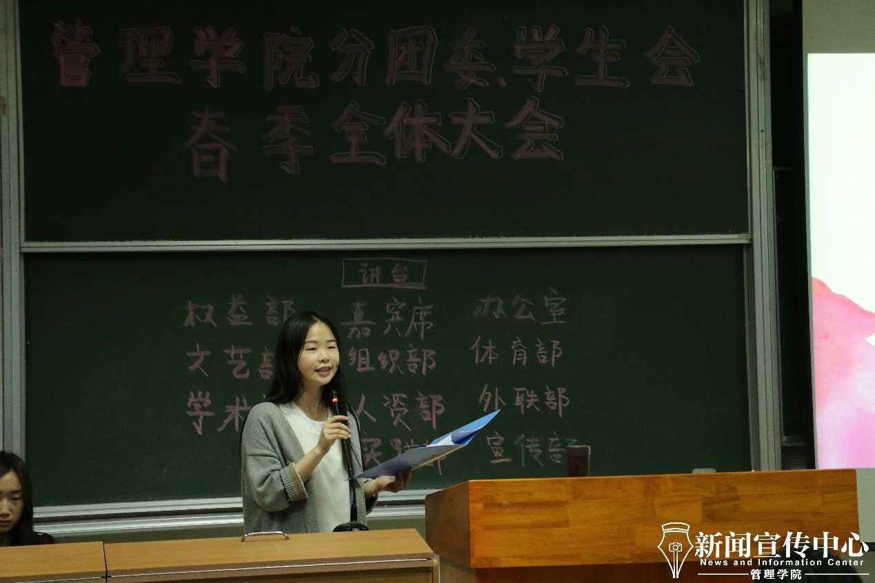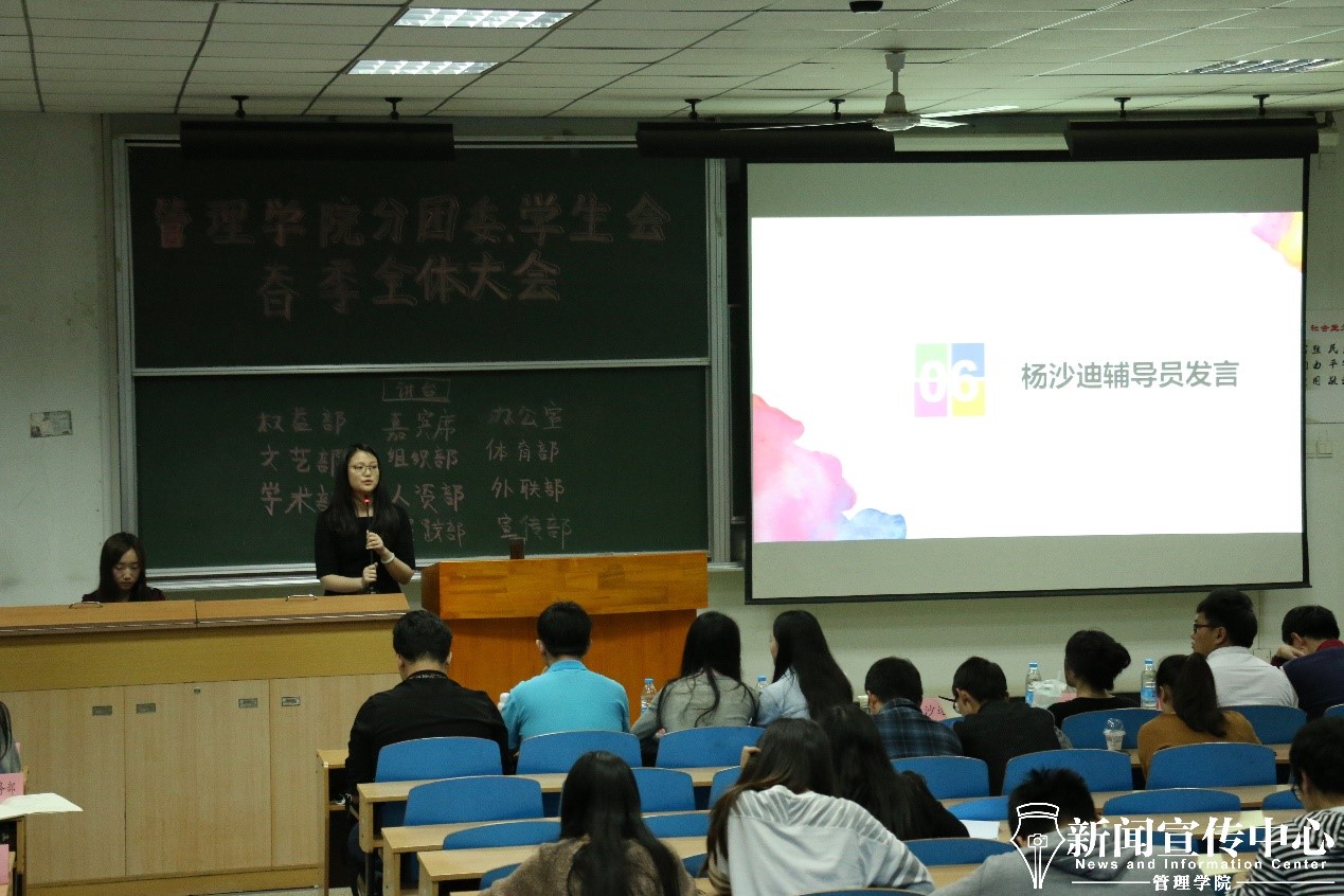随后,分团委、学生会书记杨沙迪进行了发言。她表示,分团委、学生会从始至终传承着“家文化”,每个部门也有着独特的文化,希望各位成员能够获得归属感,感受到自己的价值。同时,分团委、学生会也为大家提供了一个锻炼自我、提高自身能力的平台。分团委、学生会是精英化、标准化、规范化的,每一位成员也应将这种意识带入生活中,严格规范自己。