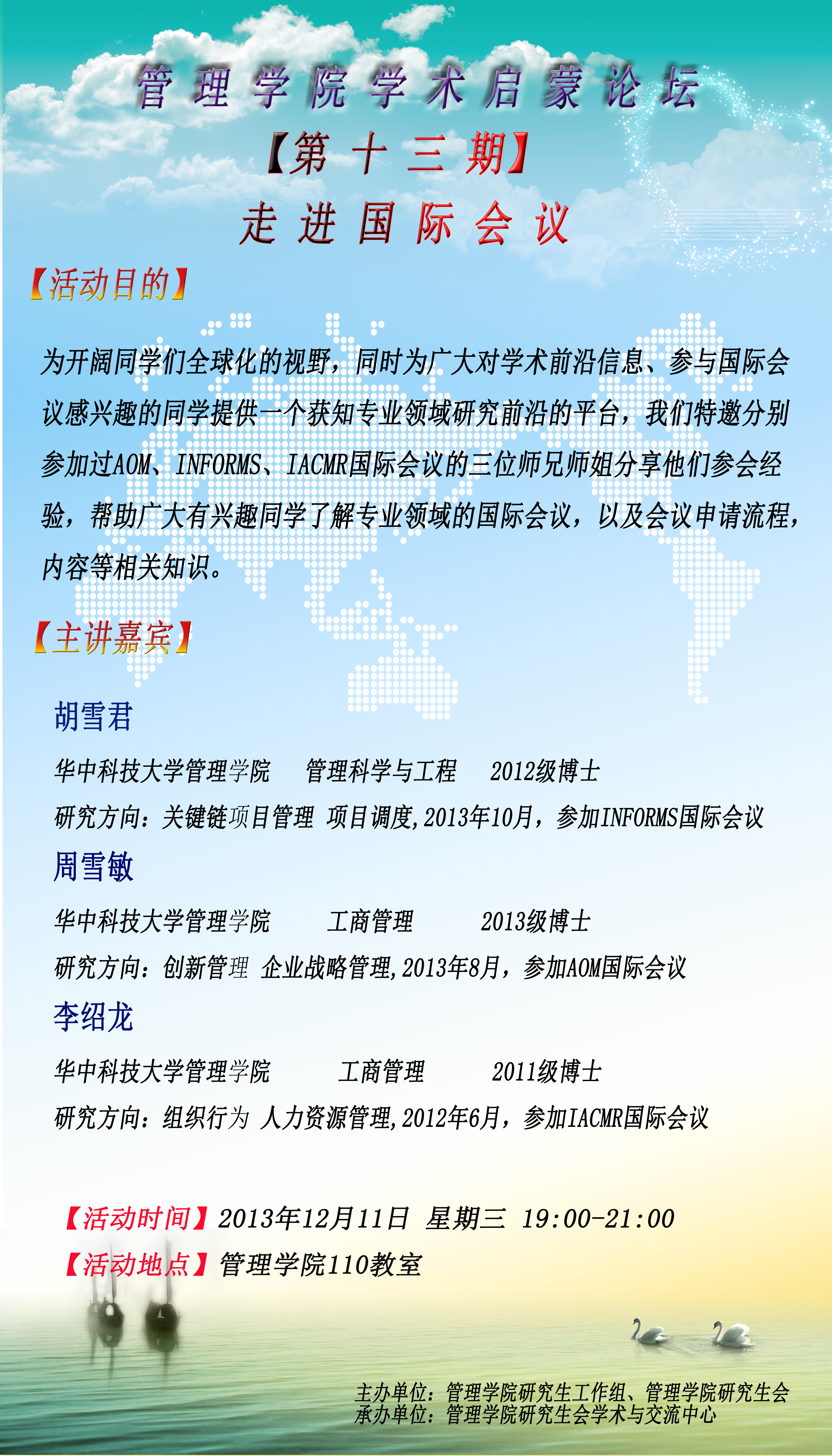 活动目的:为开阔同学们全球化的视野,同时为广大对学术前沿信息、参与国际会议感兴趣的同学提供一个获知专业领域研究前沿的平台,我们特邀分别参加过AOM、INFORMS、IACMR国际会议的三位师兄师姐分享他们参会经验,帮助广大有兴趣同学了解专业领域的国际会议,以及会议申请流程,内容等相关知识。
