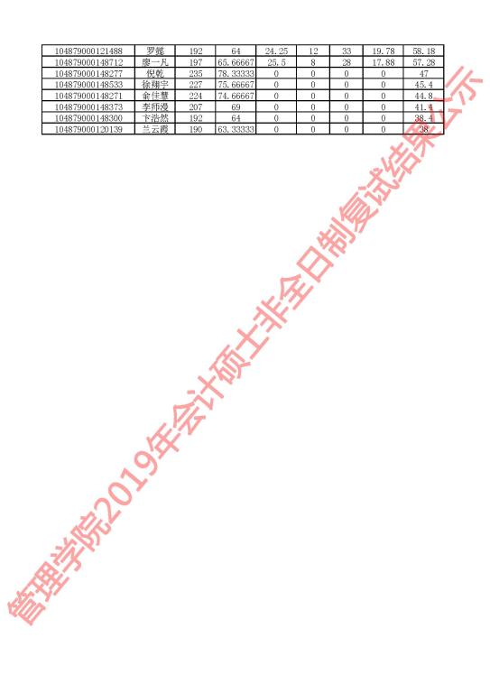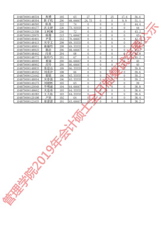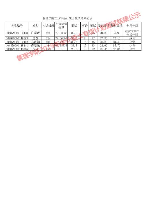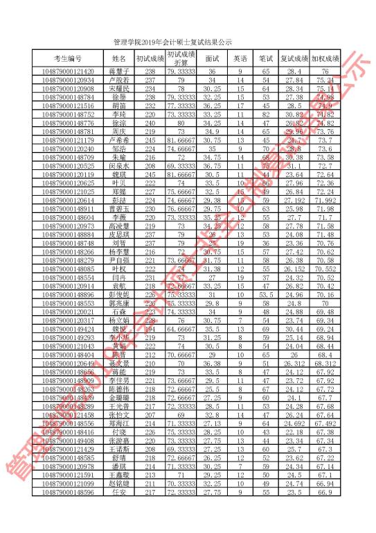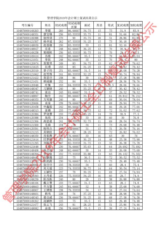 根据学校有关要求,现对我院2019年会计硕士研究生复试成绩进行公示,详见下图。公示期为5个工作日。公示期内,学院研究生招生监察组通过电子邮箱glxy@hust.edu.cn接受考生申诉。