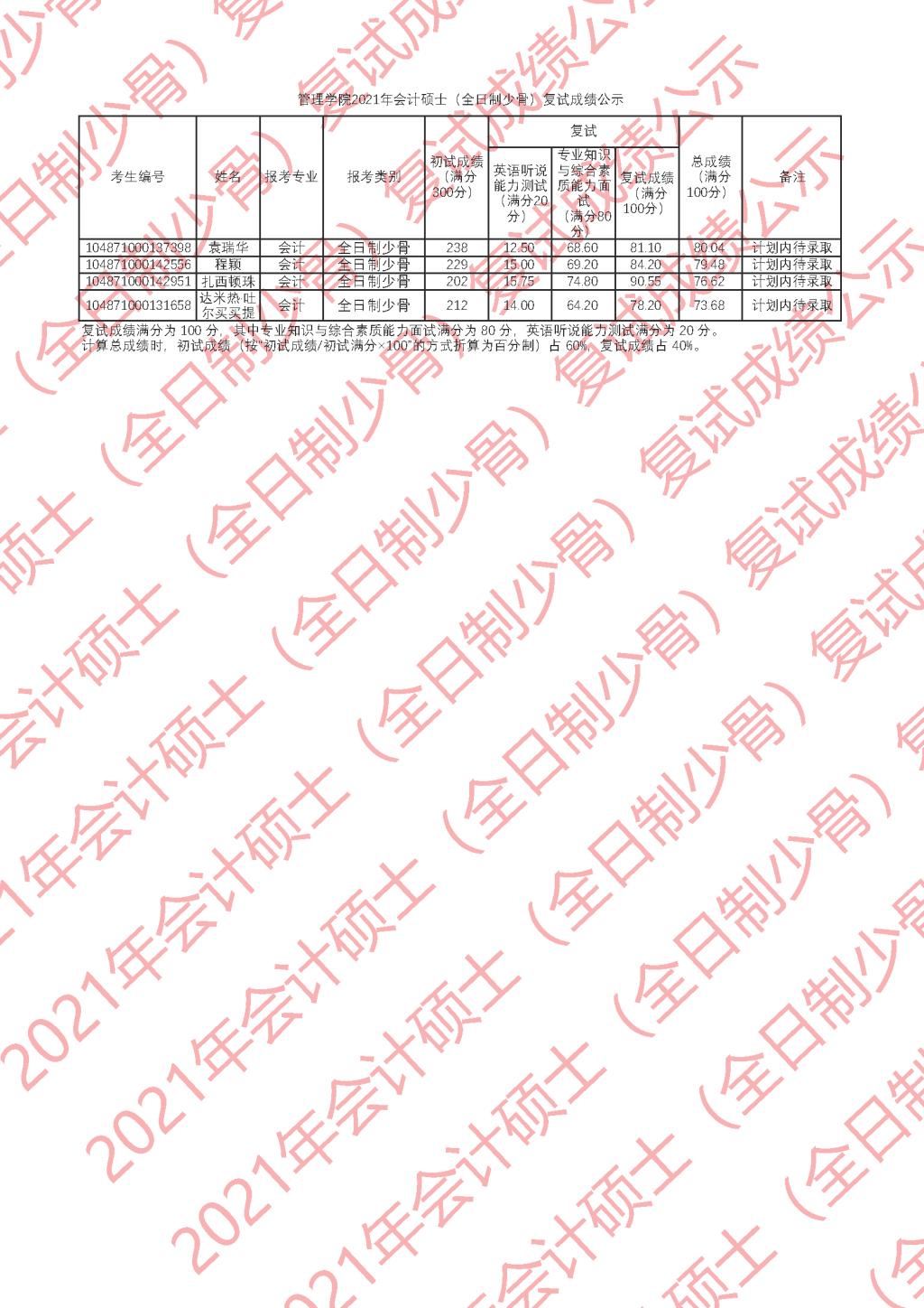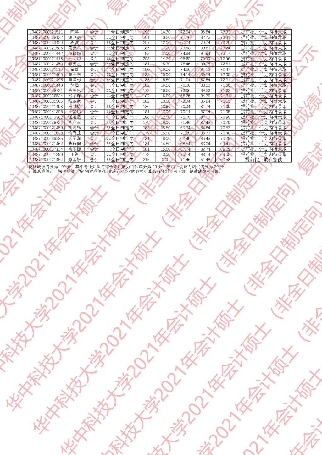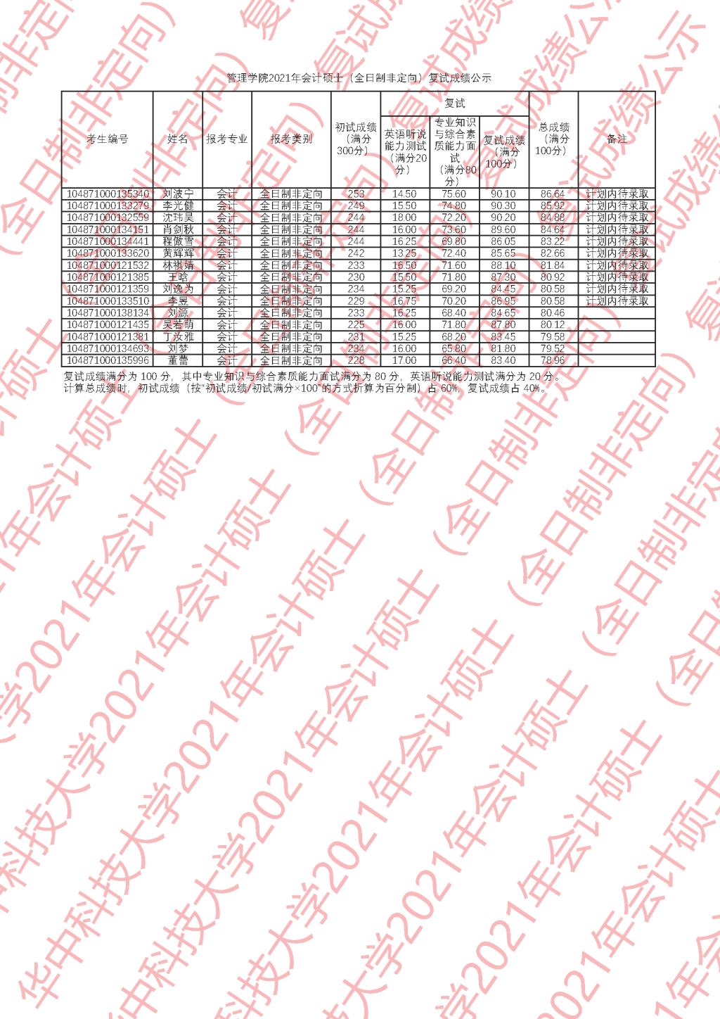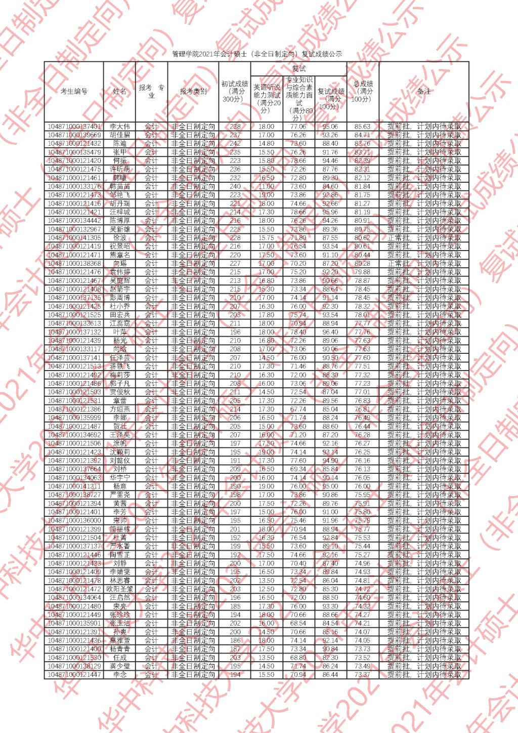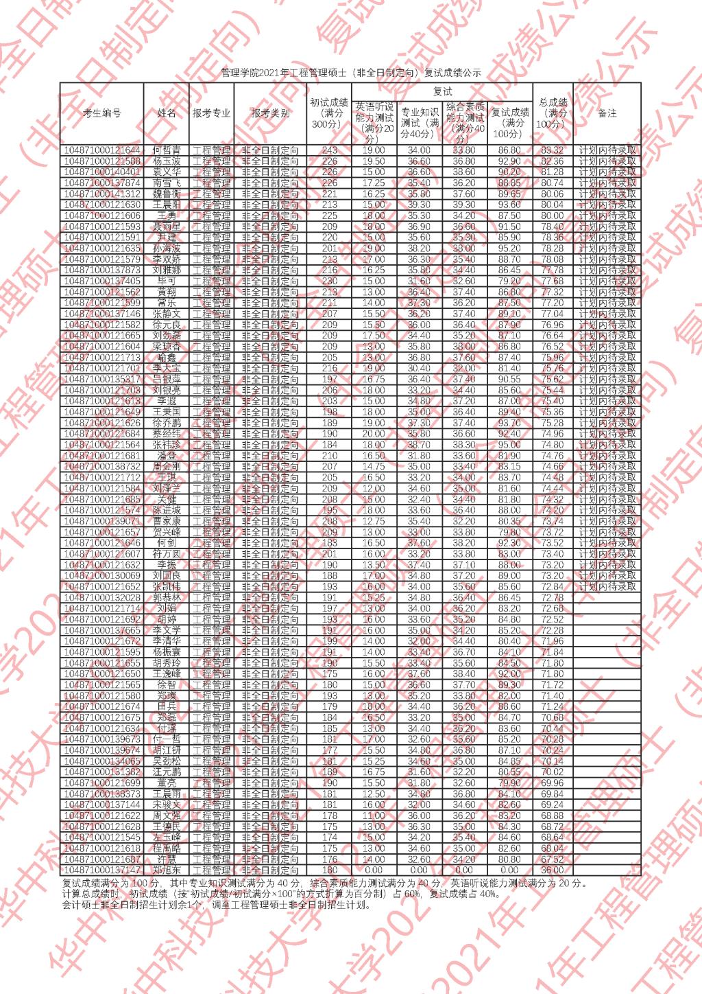 根据学校有关要求,现对我院2021年会计硕士、工程管理硕士研究生复试成绩进行公示,详见附件。排序说明:按各专业报考类型对总成绩进行排序,若考生总成绩相同,则按考生初试成绩排序。公示期为2021年3月29日——4月2日。公示期内,学院研究生招生监察组通过电子邮箱glxy@hust.edu.cn接受考生申诉。录取以学校最终下达招生计划按公示总成绩排名由高到低录取,复试不合格(复试成绩<60 分)、思想政治品德考核不合格、报考资格不符合规定者,不予录取。若有人放弃录取,则依次递补。