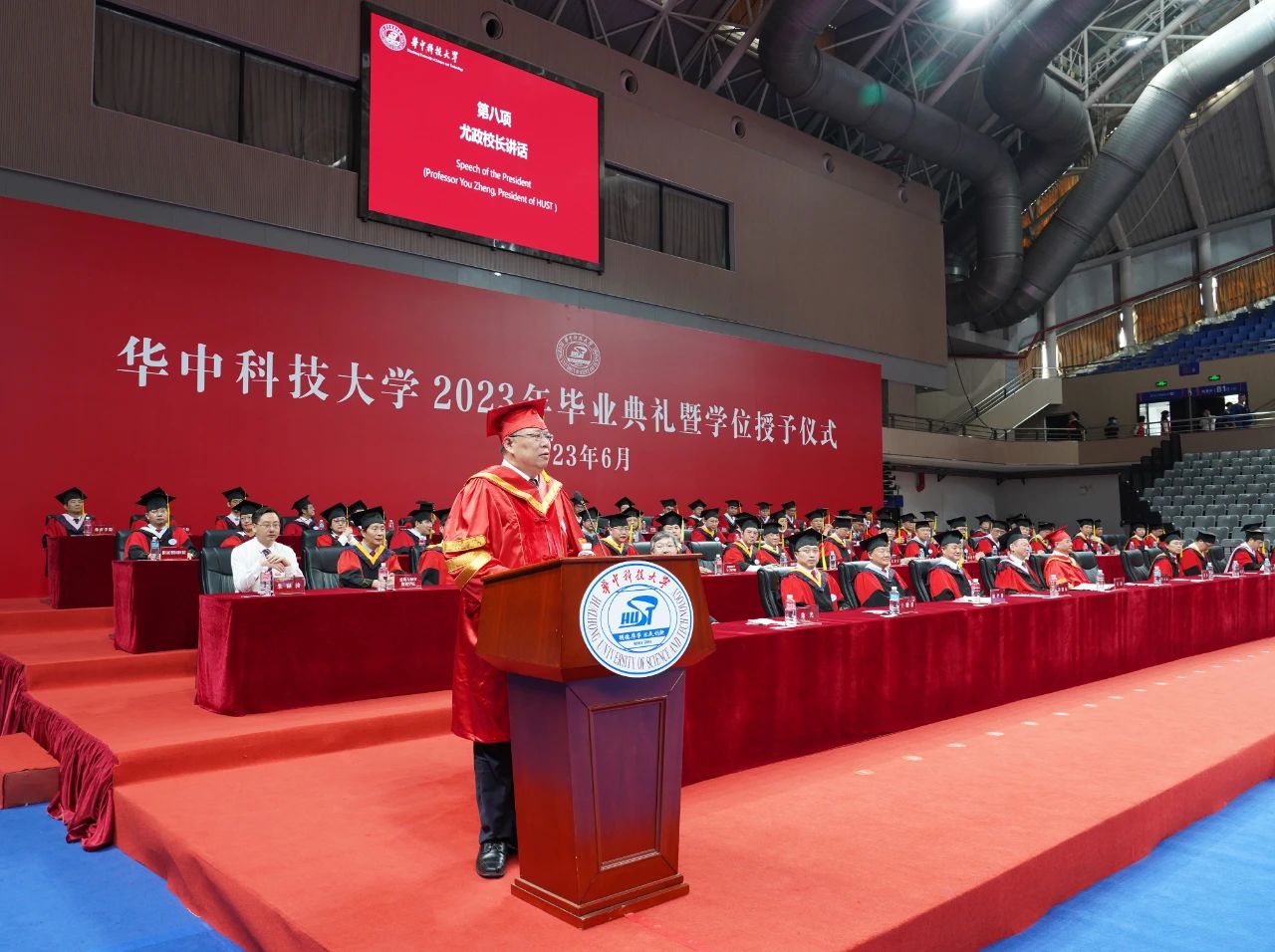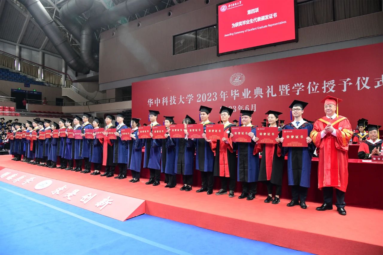 典礼上,副校长解孝林宣读华中科技大学2023年研究生学位授予决定。常务副校长王伟宣读优秀毕业生、优秀留华毕业生表彰决定,以及到西部艰苦地区、基层及国家重点单位就业毕业生表彰决定。校党委书记李元元院士为获得表彰的毕业生代表颁发证书。