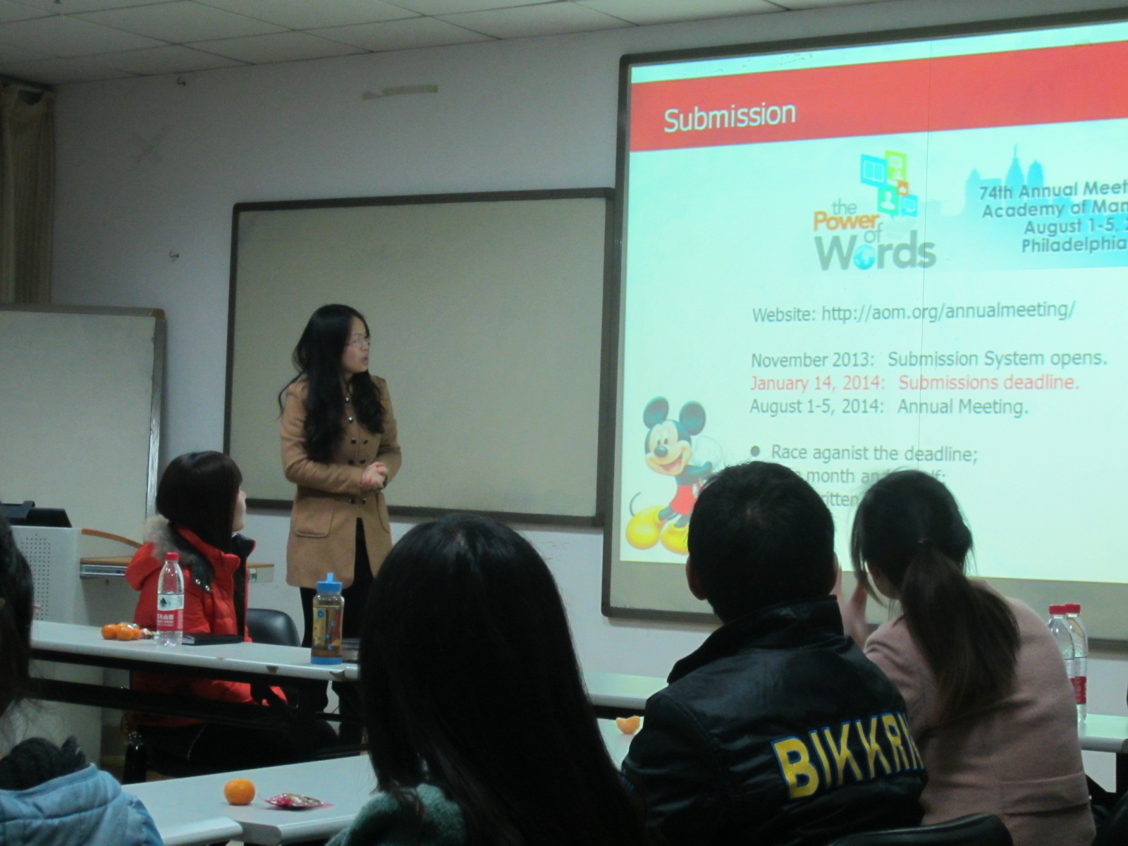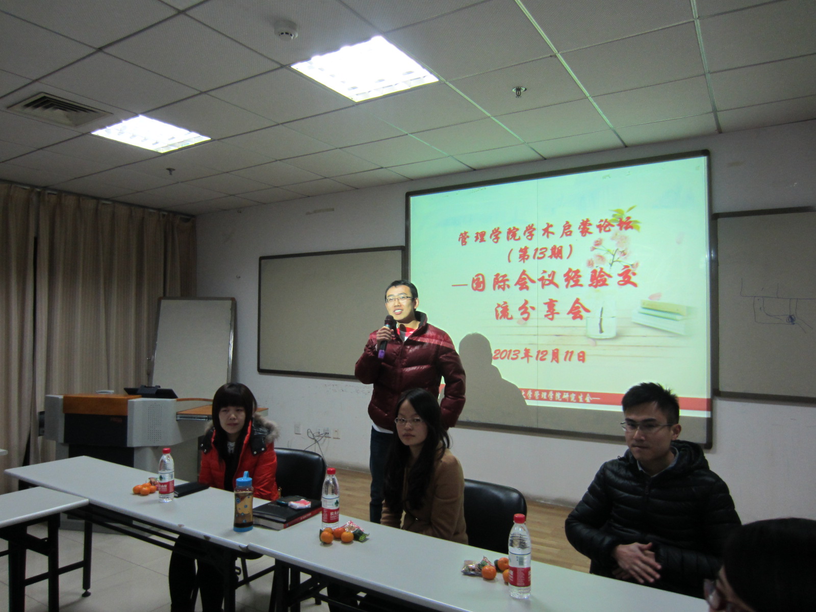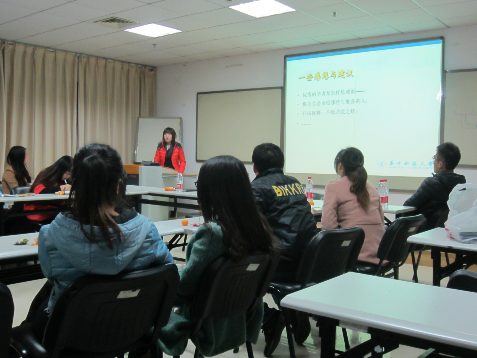 三位师兄师姐就大家所关心的国际会议的申请条件、准备工作、资助限额以及吃喝玩乐等问题向大家做了详细的介绍。胡雪君首先从参会目的、参会条件、学校相关政策三个方面详细的介绍了参加