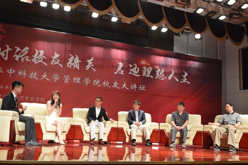 在随后迎来的校友对话环节,汪潮涌、陈军、王旭东、乔兵剑、杜新颖几位校友就自己的工作经验和同学们的一些困惑展开交流。90级校友杜新颖首先表示她非常以母校为荣,并相信学弟学妹们会更加出色。83级校友陈军笑道:“作为管院学生,什么都要懂一点。”陈军与大家分享工作经验与生活故事,郑重表示毕业后一言一行代表的不仅是个人,还有我们的母校,告诫大家不要做出有损母校的行为。88级校友乔兵剑则提出建议:一是建立科学方法论的思想,学会理论思考;二是结交良师益友帮助快速成长。88级校友王旭东分享了他学生时期的学生工作经历,他希望毕业生们将来也能够继续保持联系,共同建设华科管院的大家庭。