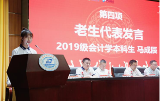 在校学生代表,本科会计1902班马成辰结合自身在华中大求学、奋斗的经历,号召大家坚持党旗领航强信念,不断提升青春的高度;坚持自立自强练本领,不断加深青春的深度;坚持务实笃行做贡献,不断拓宽青春的广度,鼓励大家在青春的赛道上跑出当代青年的最好成绩。