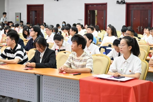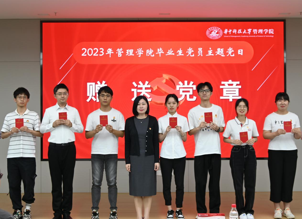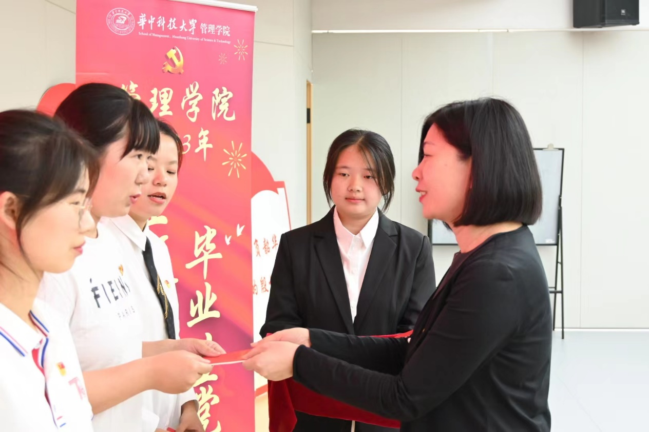 毕业生党员代表朗读各个支部的毕业留言,字字情真意切,表达对母校母院的衷心祝福。胡艳华为毕业生党员代表赠送党章,希望毕业生党员在未来也要时刻以共产党员的标准要求自己,将知识转化为力量,充分发挥党员先锋模范作用和骨干带头作用。