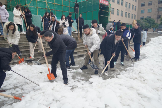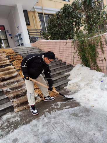 与此同时,23级本科生自才榕在返校后看到宿舍楼前的积冰后,主动帮助宿管阿姨进行清扫,展现了管院学子的担当精神,为宿舍安全贡献力量。