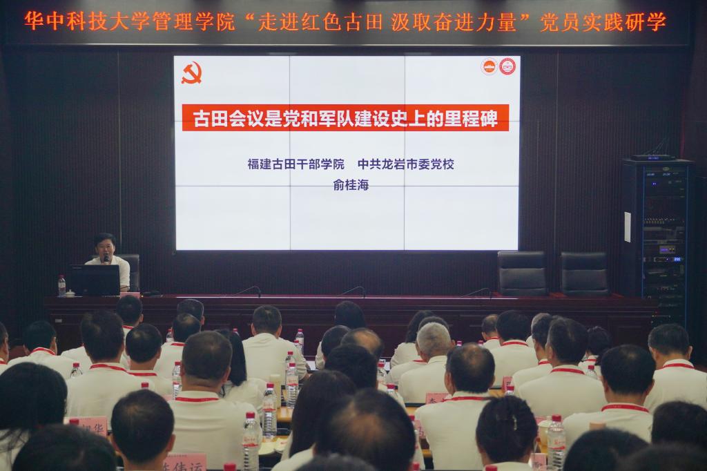 开班仪式后,福建古田干部学院、中共龙岩市委党校经济与公共管理学教研部部长俞桂海以《古田会议是党和军队建设史上的里程碑》为题开展专题教学。他围绕古田会议召开的历史背景、中国革命道路的艰难探索与古田会议的成功召开、古田会议的主要历史贡献、古田会议的精神内涵及时代价值四个方面剖析了古田会议在红军生死存亡的紧要关头的关键作用,以及“思想建党、政治建军”在新时代我党我军建设中的重大现实意义。