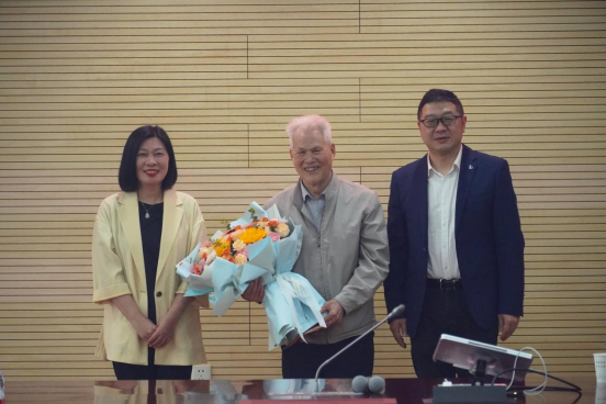 与会人员共同庆祝钱衡弼书记的90岁生日,胡艳华和杨治赠送鲜花和贺卡,祝他福如东海,寿比南山。