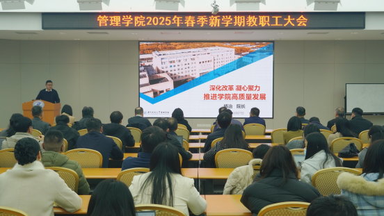 院长杨治以“深化改革 凝心聚力 推进学院高质量发展”为主题作工作报告。杨治首先介绍了学院2024年取得的突出成绩,并对2025年学院的重点工作进行部署。他指出,学院要继续推进本科新专业建设和课程组改革,提升研究生创新能力,开展有组织的人才培养。要全面推进学科交叉,完善人才特区建设,提升科研创新能力。要升级学院国际化战略,拓展国际化人才培养体系,开展AMBA再认证。要提升创新成果转化能力,开展有组织的建言献策,勇担社会责任。要加快专业学位教育改革,打造学术品牌,提升学术影响力。要加强学院文化建设,优化学院管理体系,弘扬办学特色和理念。他希望全院教职工上下一心,主动作为,确保各项工作开好局、起好步,全力打好“十四五”规划收官战。