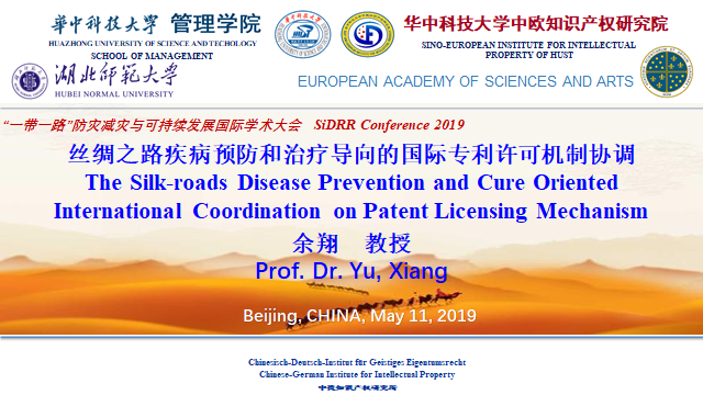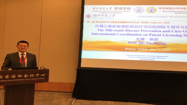 5月11至12日,由中国科学院、联合国环境署(UNEP)和国际科学组织联盟(ANSO)等联合主办的“一带一路”防灾减灾与可持续发展国际学术大会在北京召开。中科院白春礼院长、联合国助理秘书长水岛真美女士、联合国环境署及减灾办公室官员代表、中国生态与环境部黄润秋副部长等致开幕词,来自世界多国科学院的院士、专家学者在会议上作了多视角、精彩纷呈的学术报告,共有来自40多个国家的700多名代表参加了会议。华中科技大学中欧知识产权研究院院长、Bevictor伟德中德知识产权研究所所长余翔教授应邀参会,作为华中科技大学、湖北师范大学和欧洲自然科学与社会科学院的代表,作了题为“丝绸之路疾病预防和治疗导向的国际专利许可机制协调”的报告。
