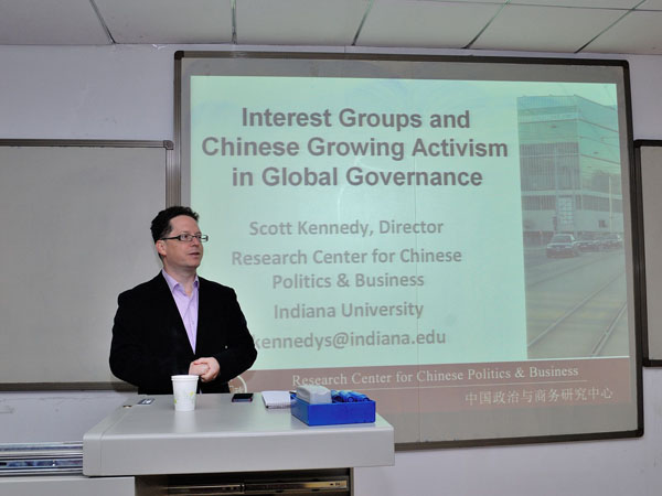 Scott Kennedy首先介绍了中国在全球治理中的定位。他以人民币和稀土为例,形象说明了中国加入WTO后的角色定位及其给全球治理带来的影响,并发表了自己的看法:中国怎样有效学习、利用和影响全球经济体系的规则;以及中国在行政体系方面是否能比别人适应的更好。接着,他介绍了中国在全球治理中的参与形式,这种形式主要表现在政策和规则的制定上。最后,Scott Kennedy向大家展示了他研究的主体,包括国家政权类型、中国的企业类型、中国政府组织等。他跟大家分享了自己的研究过程,以及个人的研究成果。整个学术报告图文并茂,演讲生动有趣。