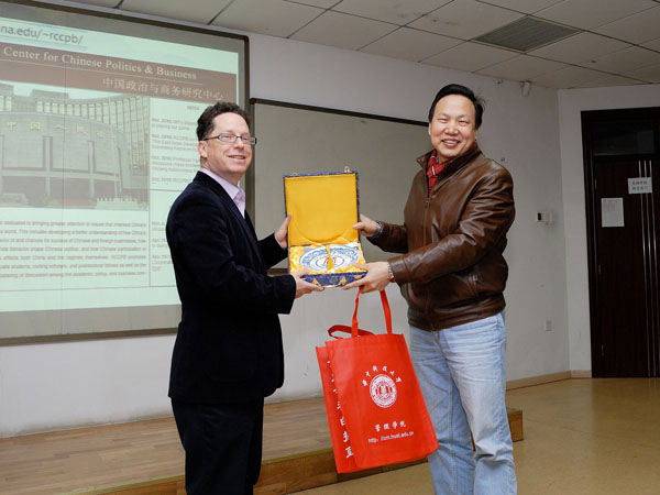 在提问环节,在场师生踊跃提问。有的针对自己切身实际,询问关于提升自身素质的相关问题,有的针对文献中对现象和研究讲的很透彻可是理论贡献讲的少的情况,询问如何发掘其深层次的理论贡献。Scott Kennedy针对所提问题,一一做出了解答。讲座最后,在全场师生热烈的掌声中,田志龙向Scott Kennedy赠送了礼物。