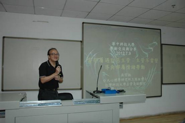 (新闻信息中心记者 周 琴/文)7月9日,台湾科技大学企业管理系主任林孟彦教授和企业管理系吴宗祐副教授来访管院,在管院110教室为师生带了两场专题讲座,即“口碑营销”、“当部署遇到恶主管”。工商管理系大部分教师和众多学生聆听了此次讲座。讲座由工商管理系主任田志龙教授主持。