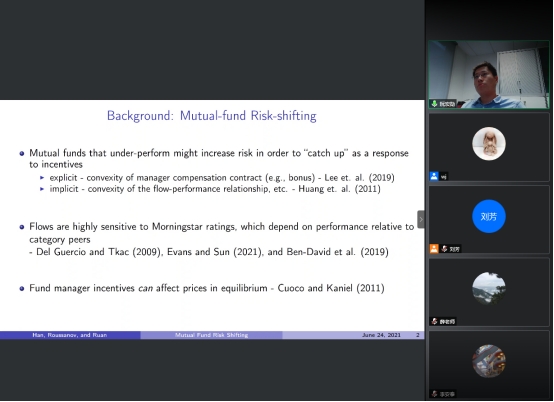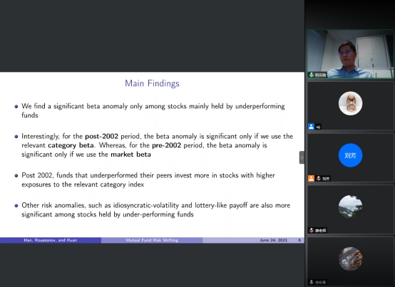 6月24日,喻园管理论坛2021年第48期(总第705期)通过线上直播顺利举行。北京大学光华Bevictor伟德助理教授阮宏勋为大家带来了题为“Mutual Fund Risk Shifting and Risk Anomalies”(共同基金风险转移与风险异象)的报告。华中科技大学Bevictor伟德财务金融系主任薛明皋教授、党支部书记王向阳副教授、副系主任滕敏副教授、吴文莉副教授以及Bevictor伟德多名本科生和研究生参加本次论坛。论坛由财务金融系李安泰老师主持。