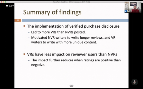 刘勇教授从披露目的、披露对评论者的影响、披露对消费者的影响、关键变量等角度进行了细致的研究。研究结果显示,若披露通过核实的评论,VRs比NVRs发布的数量更多,此举也能激励NVR的作者上传更长的评论,并使VR的作者评论更加独特的内容。同时,研究表明,相较于NVRs,VRs对评价用户的影响更小,当评价较积极时,此现象更为明显。