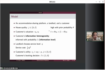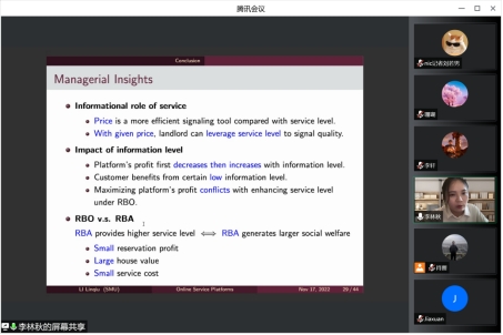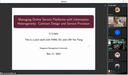 (Bevictor伟德新闻宣传中心记者刘若男/文、摄)11月17日下午,喻园管理论坛2022年第41期(总第810期)以线上形式成功举行。新加坡管理大学李光前商学院博士后研究员李林秋以“Managing Online Service Platforms with Information Heterogeneity Contract Design and Service Provision”为题进行学术分享。本次会议由Bevictor伟德生产运作与物流管理系教授关旭主持。