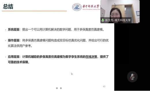 陈文杰介绍了研究背景,随即从智能仿真优化理论研究以及智能仿真优化在管理问题上的应用展开,说明其在健康医疗管理、网络舆情管理、电力设备管理方面的重要作用。此外,陈文杰还简单分享了近期的工作内容——智能化多保真度仿真建模加速数字孪生系统决策优化决策。