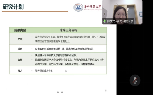 对于未来的工作,她从研究计划、教学计划两个方面展开,表示将着重研究智能仿真优化在健康医疗管理上的应用,并阐述了原因、可行性及研究意义。