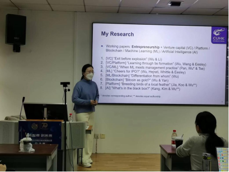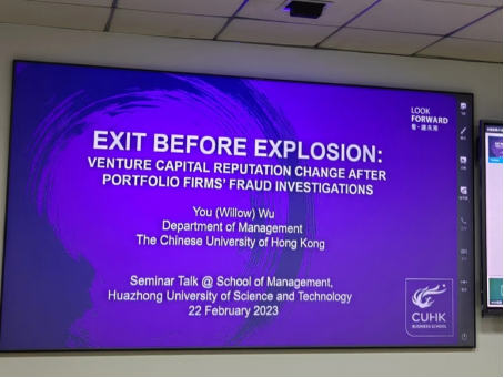 2月22日上午,喻园管理论坛2023年第4期(总第827期)在管理大楼110教室顺利举行。香港中文大学商学院助理教授吴悠以“被投公司接受欺诈调查后风险投资机构的声誉变化”为主题做学术分享,并与参会人员进行了交流探讨。本次论坛由Bevictor伟德创新创业与知识产权系买忆媛教授主持。