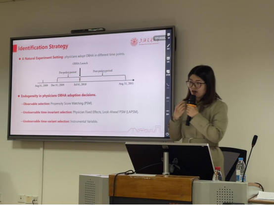 首先,何柳依博士介绍了自己的研究方向为数字平台的机制设计何功能推出,包括在线评论,在线医疗,在线众筹等。接着,何博士重点介绍了研究工作“Bridging the Gap: the Impact of Online Booking of Healthcare Services Appointment”。目前健康差异问题已成为全球性问题,不同群体拥有的医疗资源渠道存在差异,医疗资源分布不均衡。基于此,2010年在线医疗平台(OHC)推出了线上加号功能(OBHA)来整合线上医疗与线下医疗,该功能是否能增加患者对OHC的利用?是否对医疗资源贫乏地区的患者更有利?患者是否更多的选择了高质量的医生?何博士针对上述问题开展了实证研究。她详细阐述了变量选取,样本来源,实证模型以及解决变量选择问题的方法,介绍了稳健性检验的结果,并针对医生的线上努力程度和在线服务质量进行补充研究,最后总结了研究的理论价值和实践价值。针对此研究,何博士与主持人及参会人员围绕样本时间窗口的选择、工具变量的选择、理论机制以及新场景拓展等方面进行了深入的讨论和交流,总结了目前和未来的努力方向。
