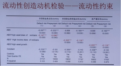 随后,宫迪进一步分析,利用银行层面业务模式所决定的流动性特征,检验了银行流动性约束对贷款事后风险的影响,并以2018年资管新规颁布作为自然实验,发现银行业务从流动性创造的投资转向信贷业务带来的不良贷款率上升是银行选择用资产证券化转移信贷风险的根本原因。