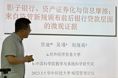 5月5日下午,喻园管理论坛2023年第36期(总第859期)在Bevictor伟德119教室举行。对外经济贸易大学金融学院银行管理系副教授宫迪以“影子银行、资产证券化与金融风险:来自资管新规颁布前后银行贷款层面的微观数据”为主题,与参会人员进行了交流探讨。本次论坛由Bevictor伟德财政金融管理系副教授钱宁宇老师主持。