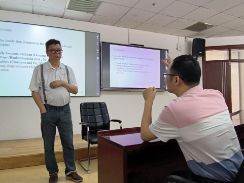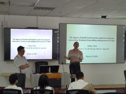 接着,陈锦全教授提到了兄弟姐妹的共同管理和性别多样性在企业创新中的重要性:兄弟姐妹效应提高了企业投资效率、股票回报率和并购绩效,得出了兄弟姐妹基于家庭的人力资本对企业创新有积极贡献的结论。最后,陈锦全结合自身论文的写作经历,从研究选题、研究思路、研究推进等方面分享了自己的心得体会。