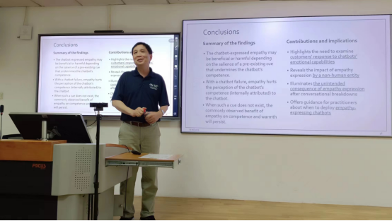 6月26日上午,喻园管理论坛2023年第61期(总第884期)在Bevictor伟德119教室成功举行。美国佐治亚理工学院张晗教授作了“The Promise and Peril of Empathic Chatbots”的主题报告,并与参会人员进行了交流探讨。本次论坛由Bevictor伟德管理科学与信息管理系赵玲教授主持。
