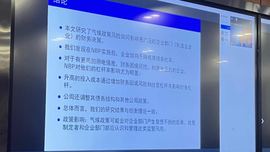 分享过程中,余天成以氮氧化物预算交易项目-NBP为着力点,深入研究气候政策风险如何影响更广泛的企业部门(制造企业)的财务决策,通过对模型演算、数据样本观测、异质性分析证实NBP对拥有高用电强度、财务困境风险及竞争压力企业杠杆率的影响尤为明显,由此发现气候政策可能会对企业部门产生一定的影响并针对此影响提出了相应的建议。