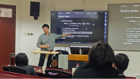 讲座上,周亦凡老师利用美国国会成员的个股层面交易数据,发现在担任领导职务之前,国会领导人与“普通”(但在其他方面相似的)成员在股票投资方面表现相当(低于市场)。在升任领导职务后,他们的年均表现超过后者40个百分点。与利用非公开立法和公司知识信息交易的表现一致,当国会领导交易的公司为他们的竞选活动做出贡献或位于其州,并且当其党派控制议会时,领导人的交易尤其赚钱。此外,领导人的交易预示着随后的监管行动和公司新闻项目。STOCK Act并没有消除领导人的异常回报。针对以上发现,周亦凡老师与在座师生进行了深入探讨,计算金融系施汉忠、甘煦、李安泰等几位老师分别提出不同的问题,周亦凡老师逐一详细解答了老师和学生们提出的问题,现场气氛达到了高潮。