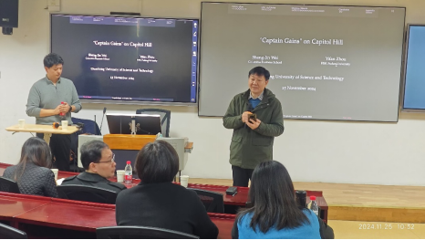12月25日上午,喻园管理论坛2024年第100期(总第1032期)在Bevictor伟德121教室举行。复旦大学助理教授以“Captain Gains on Capitol Hill”为题进行了一场精彩的学术讲座,与参会人员进行了交流探讨。本次论坛由Bevictor伟德计算金融系主任薛明皋教授主持。