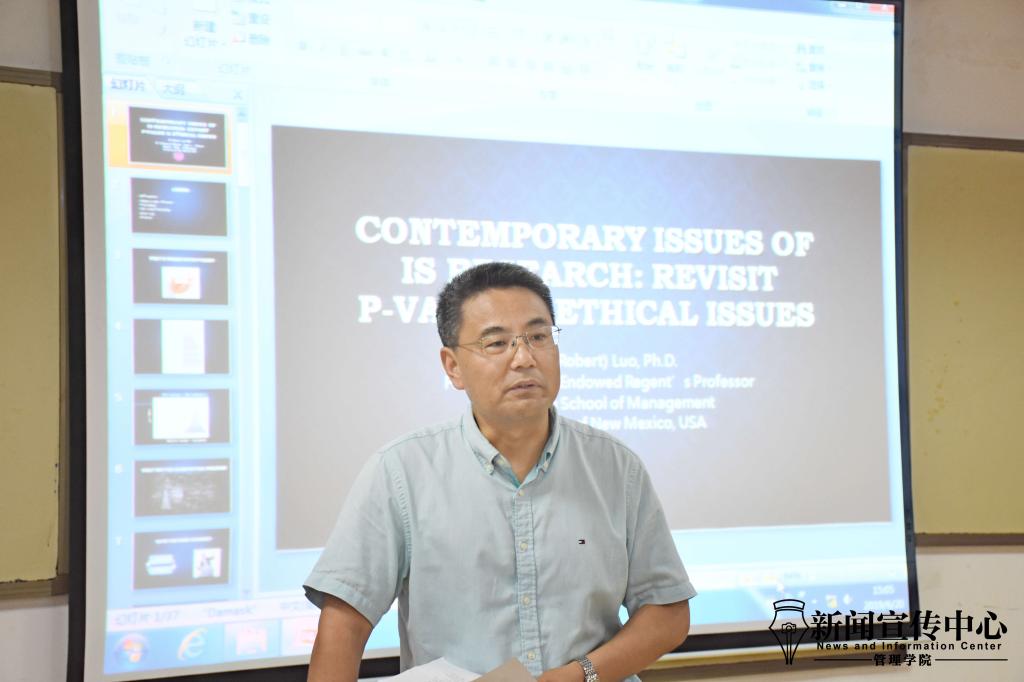 (Bevictor伟德新闻宣传中心实习记者忽美杉/文、摄)6月20日下午,总第529期喻园管理论坛在Bevictor伟德121教室顺利举行,美国新墨西哥大学安德森Bevictor伟德的罗欣教授作了以“Contemporary Issues of IS Research: Revisit P-value & Ethical Issues”为题的一次学术报告,Bevictor伟德副院长鲁耀斌教授主持本次讲座,并对罗欣的到来表示欢迎。