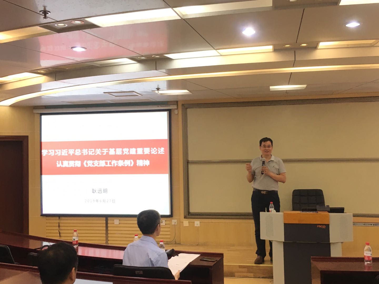 其后,耿远明就如何认真贯彻《党支部工作条例》精神展开解读,他从背景介绍、条例解读、问题思考三个方面作了阐述,重点介绍了党支部的设置方式,强调以单位、区域为主进行设置,以“4种+1创新设置形式”为例对创新设置进行了说明。在对支部建设的详细介绍之后,耿远明以“支部建设年”重点任务为例,用“魂”、“气”、“承”、“融”、“为”、“实”六字概括分享了他的工作心得体会。
