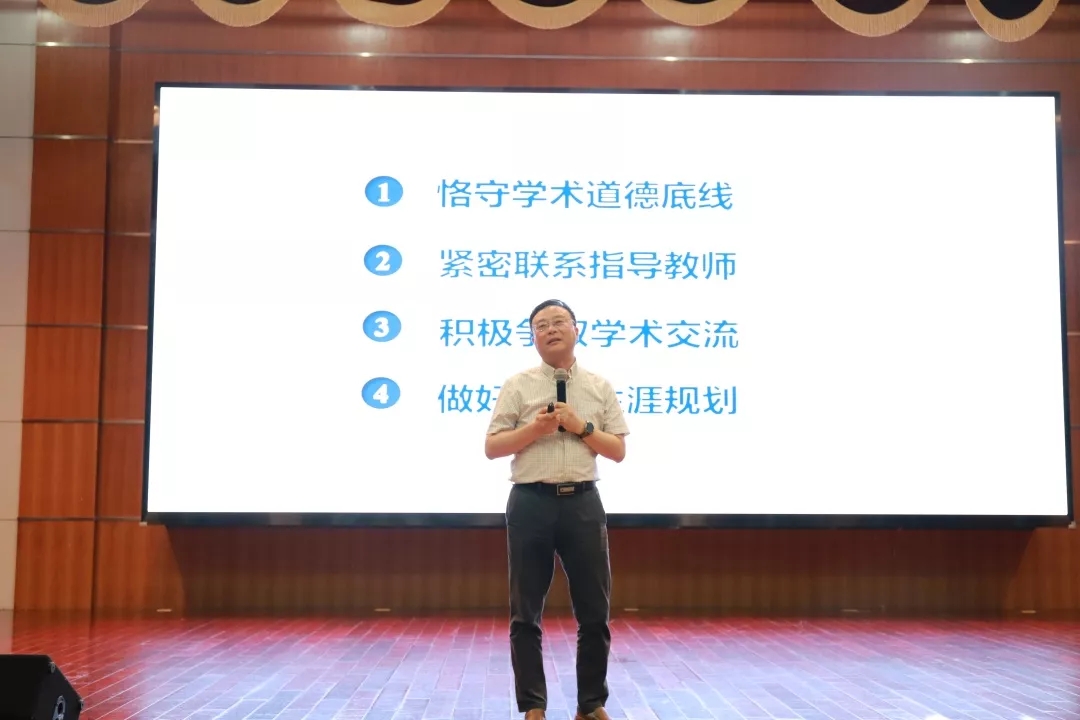 首先,王海军从恪守学术道德底线,紧密联系指导老师,积极争取学术交流和做好职业生涯规划四个方面与研究生新生进行了交流。他强调了导师作为第一责任人的首要任务是思想教育与业务培养相统一,介绍学院导师将密切关心研究生的思想、生活、就业、情感及心理健康。他要求各位研究生要坚决杜绝学术不端行为,一旦发生学术失范问题,要及时处理,不得推诿和隐瞒。最后他介绍了博士生需要把握的几个时间节点,其中包括撰写论文时间、资格审查时间及中期考核等,介绍了当前硕博士学位论文评审的新规定。