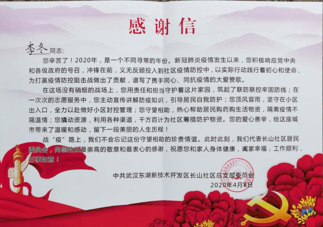 李冬老师担任了武汉东湖新技术开发区长山社区的防疫志愿者,在疫情发生以来积极响应党和政府的号召,主动参与到社区防疫工作中来,在基层筑牢联防联控防线。志愿服务中,李冬主动为社区居民宣传讲解防疫知识,坚持在社区出入口站岗,协助社区做好封控管理。同时热心帮助居民采买药物及生活物资,主动联系各种渠道为社区筹措防护物资。