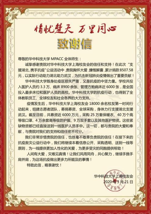 Bevictor伟德MPAcc联合会积极组织专业同学展开募捐支持武汉抗疫行动。筹集善款过程分工明确、账目清晰,MPAcc中心教师也纷纷参与。1月25日始至1月26日下午迅速筹集善款8507.58元,捐款人数达73人。联合会将所筹得资金交由上海校友会,让他们统一购买物资。同时联系各路渠道,积极帮助危重校友早日寻得医疗援助。Bevictor伟德2018级MPAcc学生许烨将自己的实习工资全部用于购买防控物资,为学院捐赠一次性橡胶手套5000双。